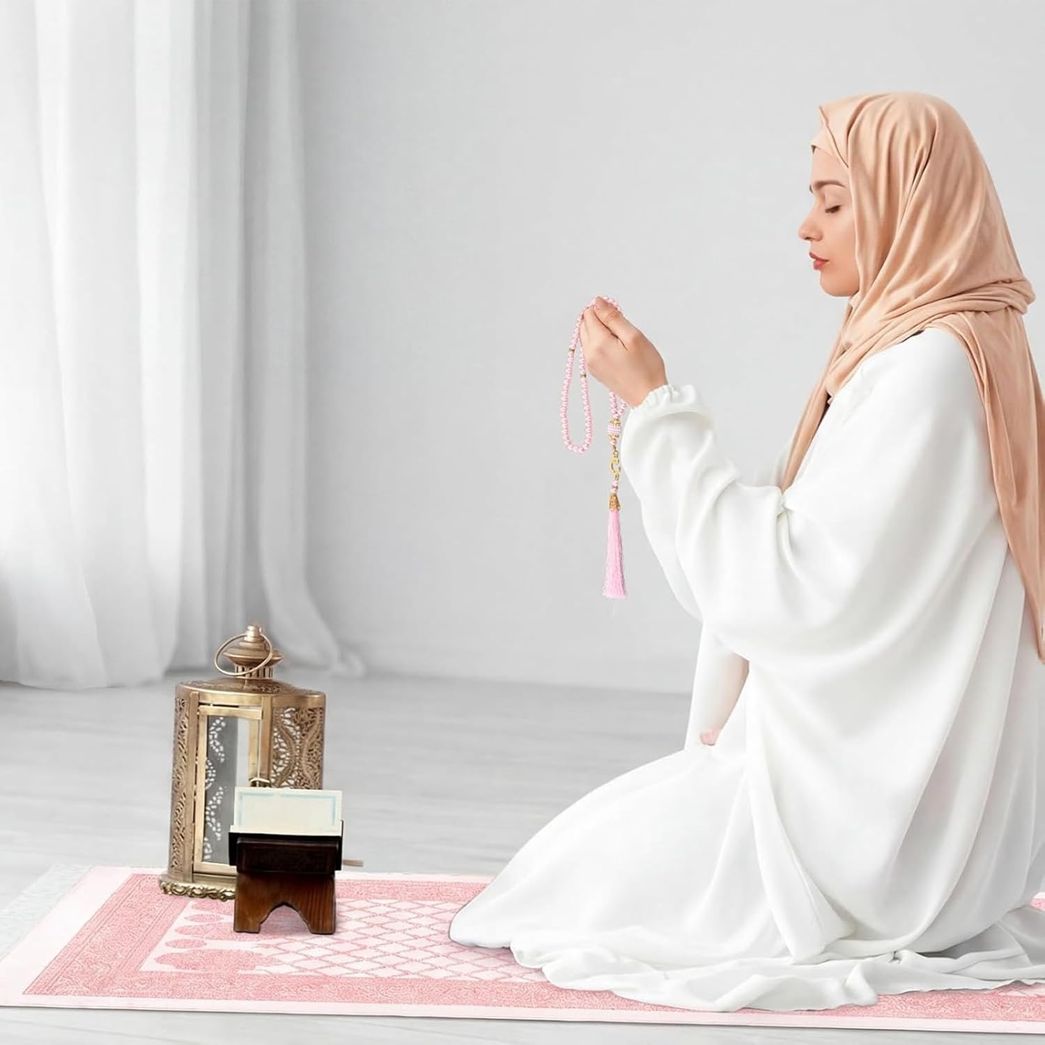 Sets Pink Muslim Prayer Mat Rug with Prayer Beads and Portable Bag Muslim Gift for Women Men, Tasbih, Janamaz, Mubarak Islamic Gift, Eid Ramadan PartyThis Islamic gift set provides everything a Muslim needs for daily prayers in one convenient package. The set upholds a commitment to both quality and detail, with materials that are both quality and durable. It also features a portable storage bag for easy and space-saving storage.The set features a soft, light pink color scheme and incorporates classic Islamic design elements. Suitable for both men and women, it's a practical choice for daily Muslim prayers and an excellent gift for commemorating special moments: whether it's Ramadan, Eid al-Fitr, Eid al-Adha, Mawlid, Hajj, Umrah, or occasions like weddings, engagements, birthdays, or bridal showers, giving this gift to family and friends will leave a lasting impression and become a cherished memento.Specifications:Material: satin, metal, polyesterPackage includes:10 x Satin bags10 x Prayer mats10 x Prayer beadsNotes:Manual measurement, please allow slight errors on size.The color may exist a slight difference due to different screen displays.
