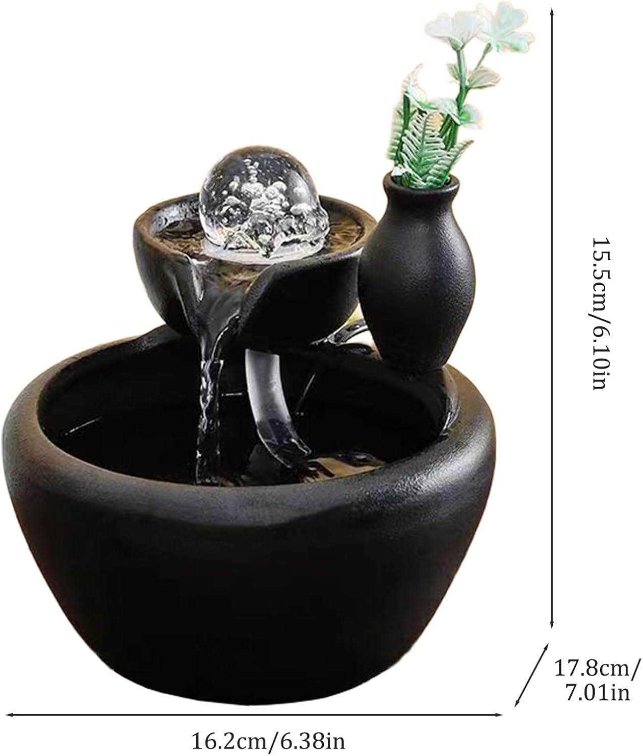 Description: Small Water Fountain Indoor Automatic Circulating Desktop Water Fountain with Crystal Ball and Small Vase Ceramic Mini Waterfall for Office Home combines the tranquil beauty of flowing water with elegant tabletop design, featuring a crystal ball and mini ceramic vase to enhance any indoor environment; ideal as a peaceful desktop centerpiece for offices and homes, this mini fountain soothing water sounds that help reduce stress, a quiet pump for automatic water circulationundefinedundefined keeps the water flowing smoothly with minimal maintenance, and a compact size that fits perfectly on desks or shelves, making it an attractive and calming decorative piece as well as a thoughtful choice for friends, coworkers, or family who appreciate soothing water features and stylish home or office décor. Features:. -Color: Black. -Material: Ceramic. -Size: 16.2x17.8x15.5 cm/6.38x7.01x6.10 inch. Note:Manual measurement, please allow slight errors on size.The colors may exist slight difference due to different screens. Package Including 1 * Small Water Fountain Indoor