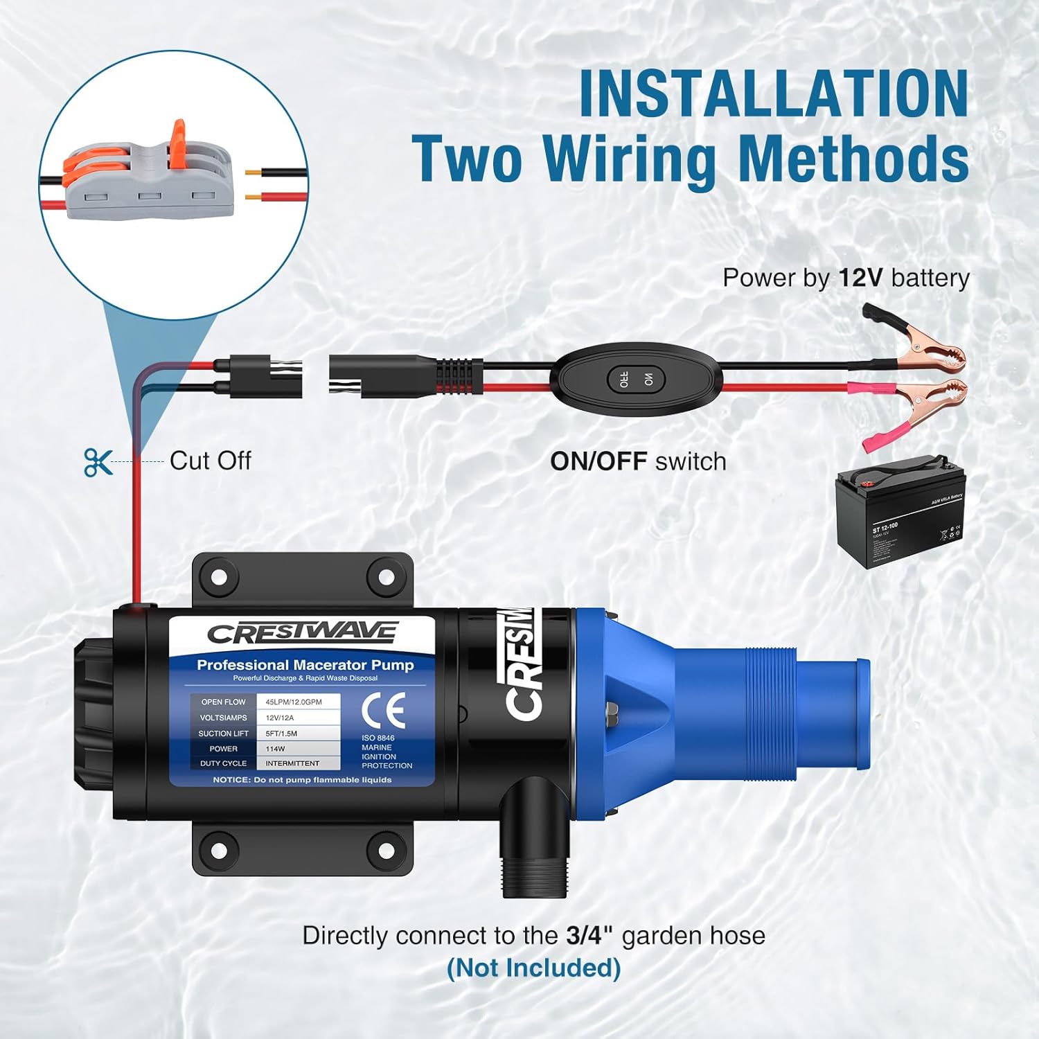 | Included Components | 12V Macerator Pump, 14AWG power lead-out wire, Quick-Connect Terminal |
