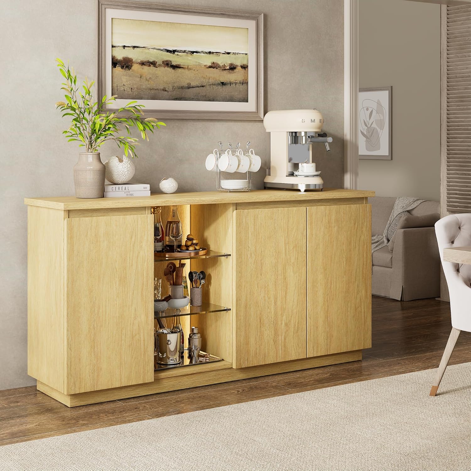 • Stylish LED Coffee Bar Cabinet: Want the perfect ambiance for your next gathering? This modern sideboard's tempered glass shelves and app-controlled RGB lighting cast a soft glow on your barware, creating a luxurious statement in any room