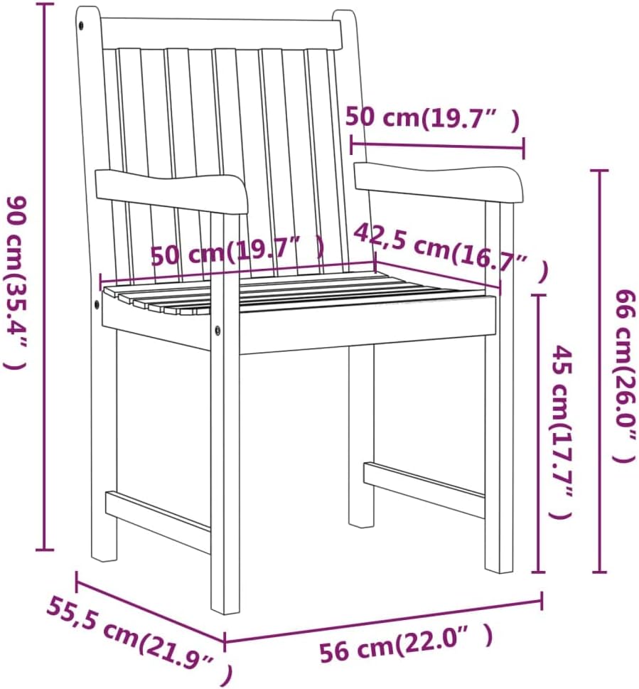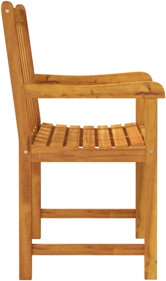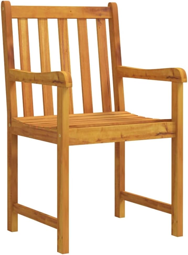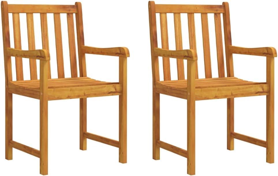 These classic wooden patio chairs provide a perfect place for you to relax and enjoy the sunshine in your outdoor living space.These armchairs, made of solid acacia wood, are weather-resistant, highly durable and suitable for outdoor use. The oil-finished surface makes them easy to clean with a damp cloth. The armrests and backrests offer great support and also add to the seats' seating comfort.Note: In order to extend the life of your outdoor furniture, we recommend you to clean it regularly and do not leave it outdoors without protection unnecessarily.Clean: Use a mild soap solution.Storing: If possible, store in a cool, dry place indoors. If the product is stored outdoors, protect it with a waterproof cover. Wipe and dry the excess water or snow from flat surfaces after a rain or snowfall. Allow sufficient air circulation to avoid moisture-related damage.Material: Solid acacia wood with an oil finishdimensions: 22" x 21.9" x 35.4" (W x D x H)Seat width: 19.7"Seat depth: 16.7"Seat height from the ground: 17.7"Armrest height from the ground: 26"Assembly required: YesDelivery contains:2 x Chair