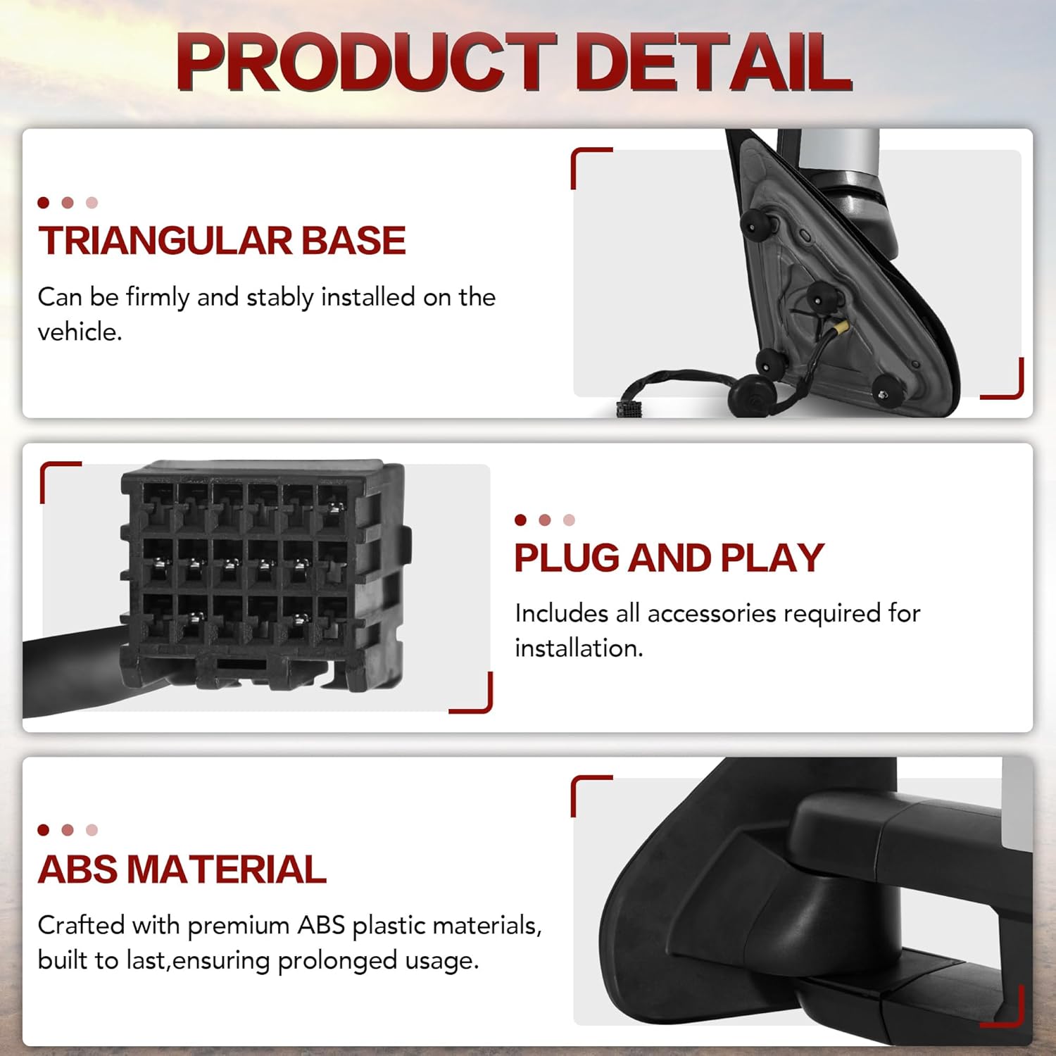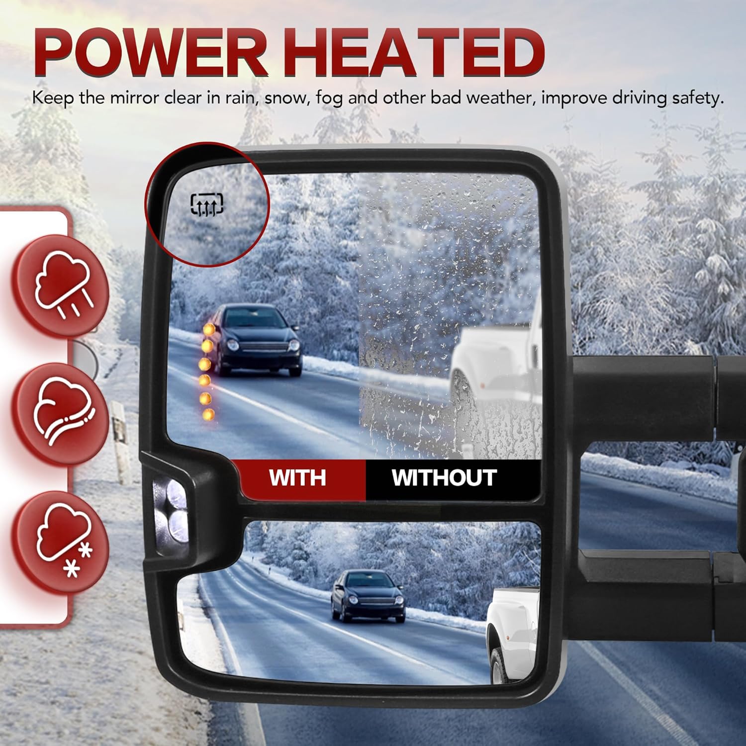 | Other Special Features of the Product | Heated Towing mirror with Flashing Turn Signal Lights,Adjustable Power glass,Built-in Amber Turn light,White Clearance Light,Chrome housing;Manual telescoping and folding |