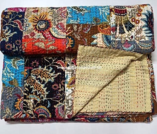 Made with 100% cotton and natural vegetable colors. This piece is of art is completely hand stitched by Women artisan in Rajasthan, India. It can make any room alive with its vivid colors, stunning Floral Floral print and embroidery, made using traditional and famous kantha hand embroidery method. Made from two thin layer of cotton fabric make this piece of art irresistible and also very comfortable. Adding to it's style, this kantha quilt is reversible and both sides can be used. Kantha is still the most popular form of embroidery practiced by rural women.typically use old saris and cloth and layer them with kantha stitch to make a light blanket, throw or bedspread. These cotton lightweight "Quilts" with a beautiful and colorful Paisley design can be used as 1. Bedspread , Bedding Throw , Blanket Or Quilt 2. A Summer Bed Cover 3. A Throw 4. A Fabulous Picnic Rug 5. Nice Bedroom Quilt , This can fit to a 90 x 108/60*90/108X108 inch's wide King/Twin size bed as blanket or throw or can easily fit as bedspread / bed cover to King/Twin bed .Size Twin (60X90), Queen Size (90X108 inch), King Size (108X108) inch