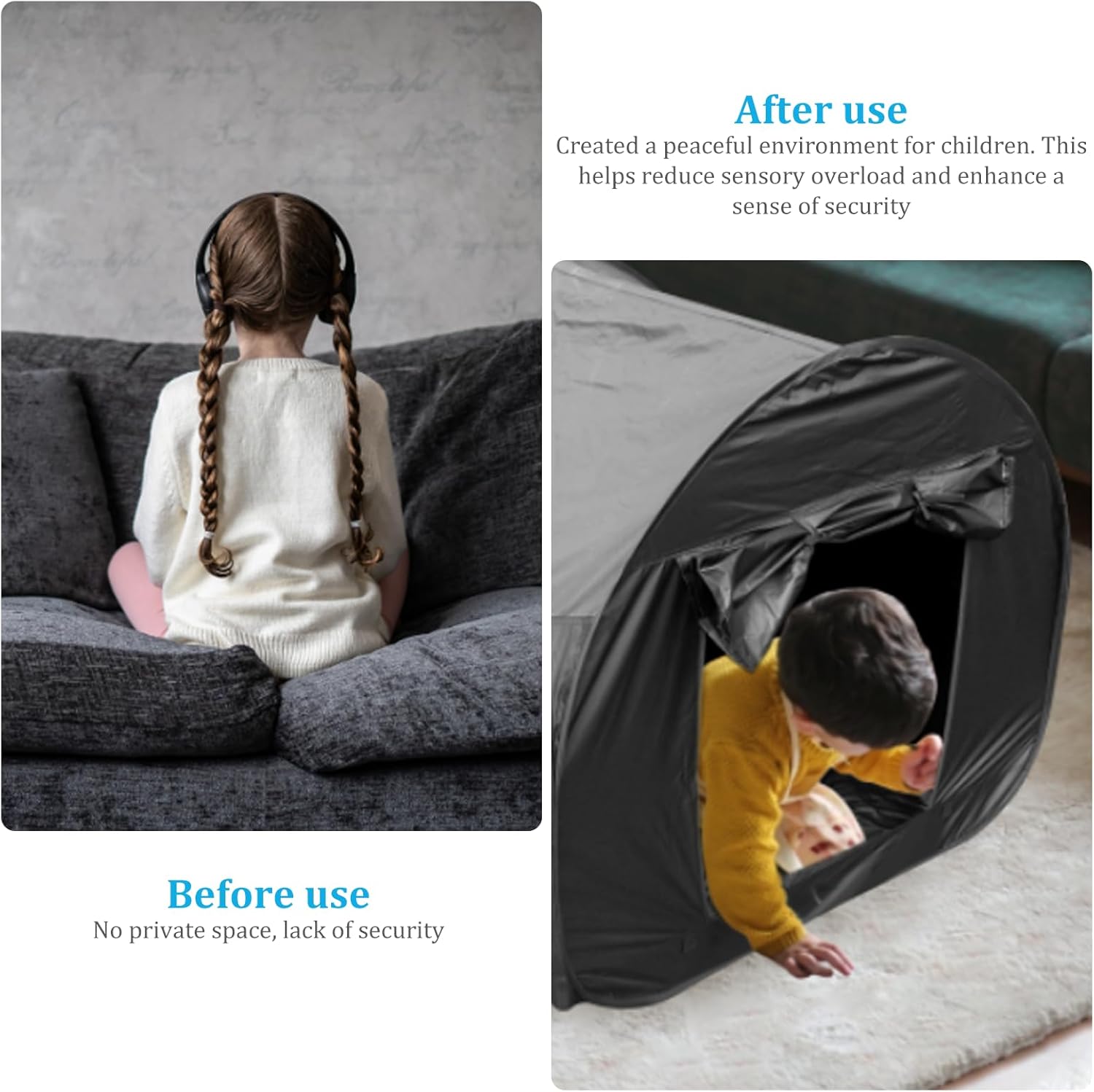 Description: Our Pop-up Sensory Tent for Kids, the perfect play space designed to engage and stimulate the senses. This 35.43-inch tent is specifically created to provide a cozy and immersive environment for children with ASD, and ADHD. Our sensory tent pops up effortlessly in seconds, making it convenient for indoor and outdoor use. The lightweight design allows for easy transport, and the included travel carry bag ensures hassle-free storage. Take the sensory experience wherever you go! Provide a world of sensory exploration for your child with our Pop-up Sensory Tent for Kids. It's a valuable tool for promoting focus, relaxation, and imaginative play. Give your child the perfect sensory haven they deserve. Features:. Pop-up Sensory Tent. -Color: Black. -Size: about 90x90x90 cm/35.43x35.43x35.43 inch. Note: Manual measurement, please allow slight errors on size. The colors may exist slight difference due to different screens. Package Including 1 * Pop-up Sensory Tent