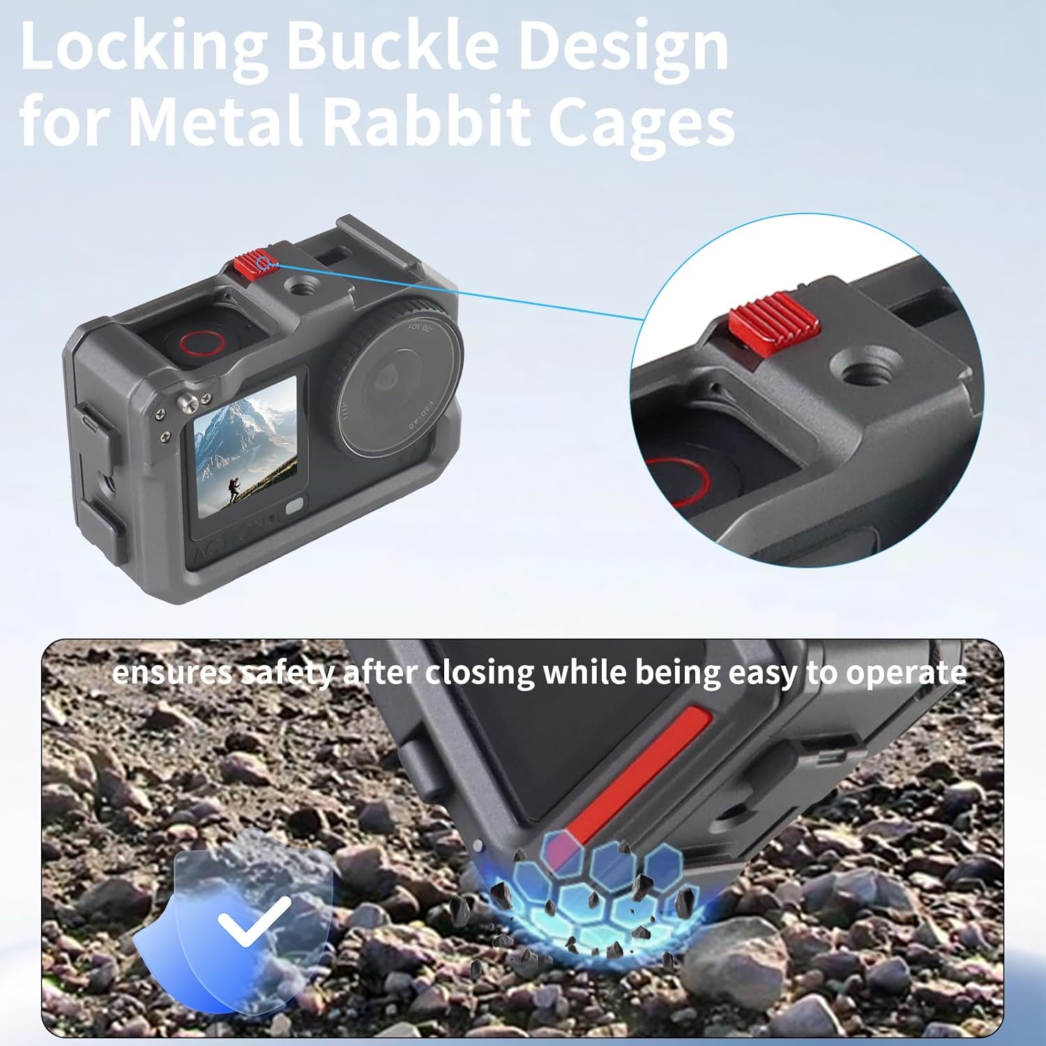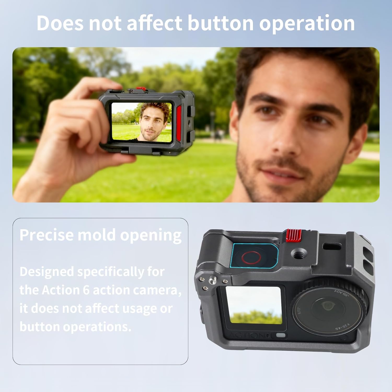 1. Protective frame designed specifically for Osmo Action 6 (flip-style design: highly practical and convenient, easy to attach) with lens cap: provides solid protection for the lens against impacts 2. Made from aluminum alloy material, offering excellent impact resistance and outstanding durability. Sturdy yet lightweight, with a comfortable, ergonomic feel. The camera protection frame incorporates foam cushion pads to securely stabilize the camera, providing superior protection and stability. 3. Streamlined frame design protects the body. Compact shape allows for easy attachment and excellent portability. Simple yet unique design fits the camera perfectly. Equipped with a hot shoe terminal and 1/4-inch screw hole, enabling connection to tripods, selfie sticks, microphones, lights, and other accessories. 4. Features: Enables quick connection with magnetic adapters. The included lens protection cap effectively prevents impact damage to the lens. Supports free switching between horizontal and vertical shooting modes for extremely convenient operation. 5. Package Contents: Camera Protection Frame ×1 + Lens Protection Cap ×1
