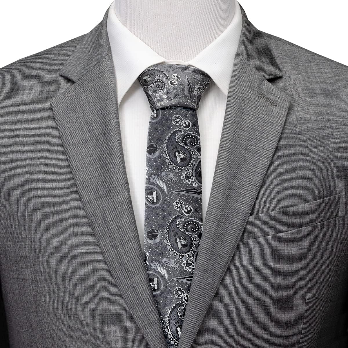 • Paisley Pattern in Gray and Black Color Palette - Designed with a gray, black, and white color scheme, this tie uses a classic paisley layout combined with subtle Star Wars imagery. The neutral tones are intended to coordinate with a variety of dress shirts and suits, making it suitable for professional, formal, or themed attire without overpowering an outfit.