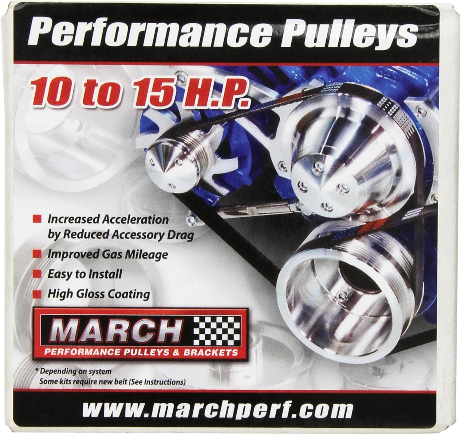 March Performance 2-groove power steering pulley is precision CNC machined and is made from 6061-T6 aluminum and is finished with a no-polish clear powdercoat for extra strength and durability.