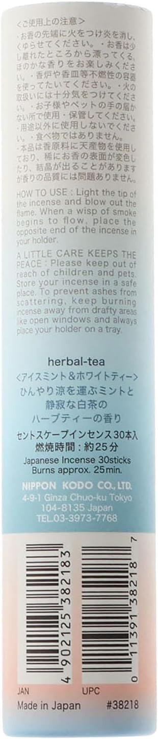 Ice Mint & White Tea ● The scent of a mint and a quiet white tea herbal tea. ● Scentscape is a scent that spreads colorful along with the transition season. The two types of scents are uniquely mixed together to create a fragrance that you want to hear now (= Slowly enjoy the aroma) The gradated color packaging is based on the heart of each fragrance, which expresses the relaxation of a fluid fragrance. ● Focusing on the features of the incense that diffuses a light scent from before lighting the fire. The lid can be removed and used as a incense holder. Not only can it be used as an incense interior, it also adds color to your life. Made in TOKYO with a handmade finish.