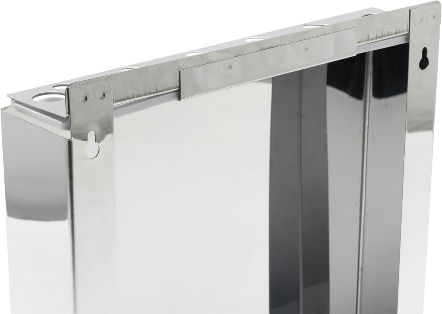 The Winco KR-9 Knife Rack offers a practical and durable storage solution for kitchens, featuring nine versatile slots within compact dimensions of 12 inches by 12-1/2 inches by 2-1/2 inches. Crafted from resilient stainless steel, this wall-mounted rack withstands the demands of both professional and home kitchens, ensuring long-lasting use and easy maintenance. Its thoughtfully designed slots include two with a 0.6-inch diameter for sharpening rods, five that are 1.8 inches wide for standard knives, and two wider 4-inch slots to accommodate larger or specialty cutlery. With its efficient layout, the Winco KR-9 keeps essential tools organized, accessible, and neatly stored—even in kitchens with limited space.